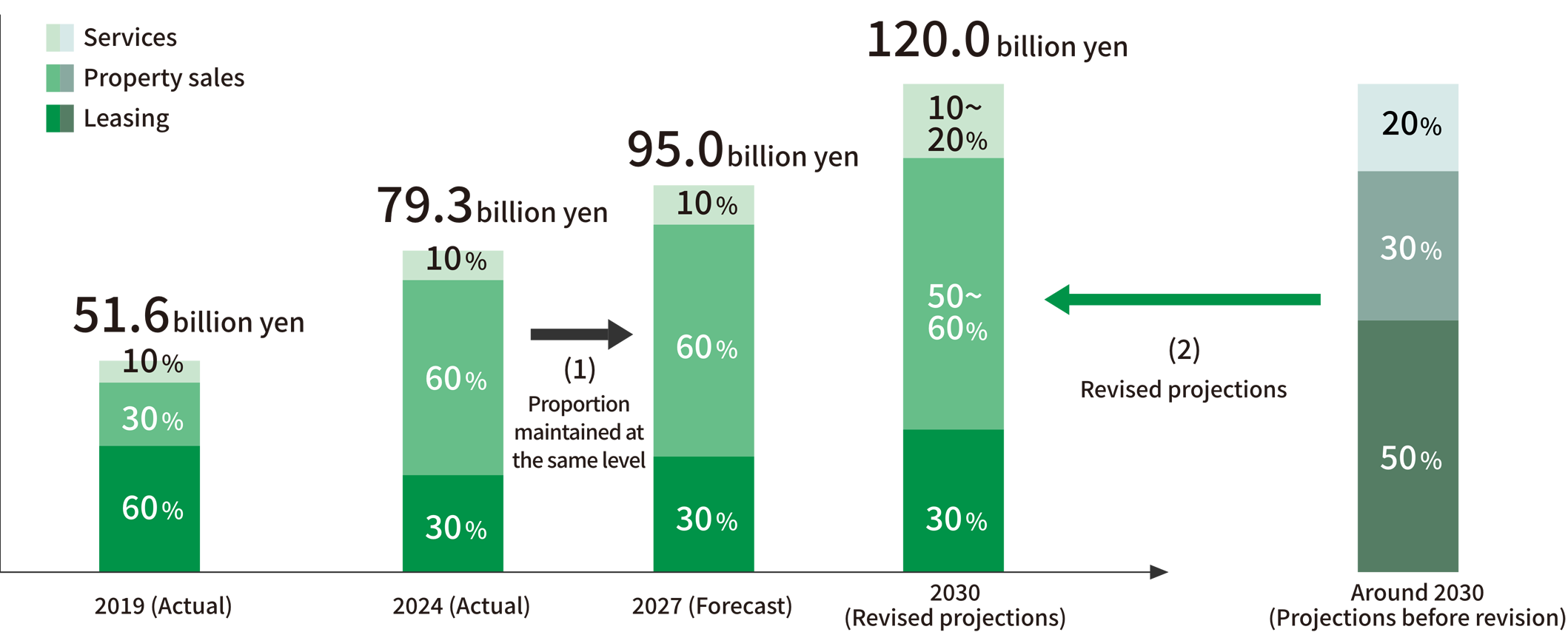 We manage our diverse businesses under the three categories of Leasing, Property Sales, and Services, based on the distinct characteristics of each. Under the new medium-term business plan, we intend to maintain the proportion of profit from each category at the level of fiscal 2024, the final year of the previous plan, while generating cash for growth investments and increasing capital efficiency. We have revised our targets for profit by category in our long-term vision for 2030, increasing the proportion of property sales and reducing that for leasing. This reflects factors such as delays in some large-scale redevelopment projects caused by rising construction costs and longer project timelines, a robust real estate market, and the continued accumulation of high-quality assets in our portfolio.