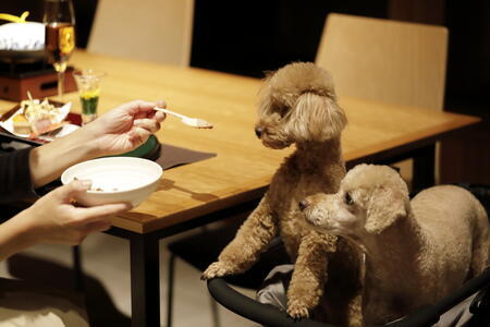 ・ 愛犬同伴で利用可能な創作日本料理レストランでは、地元食材を使った愛犬向けの専用メニューを提供。