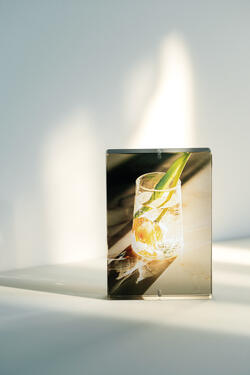 今回フォトアクリルという素材を用いてオーナメントを制作し、「透明感とは何か」という問いを視覚的に表現する展示をオーナメントとして行いました。フォトアクリルによって封じ込められた写真たちは、光や時間の移ろい・見る角度によって表情を変え、その都度新たな印象を与えてくれます。そこに映るのはただ物理的な透明の美しさではなく、幾重にも重なる記憶や、静けさ、内面の揺らぎが内包し心に映し出される感情です。その中で「透明感」とは何かを問いながら1枚1枚の写真を立体的に透かせ、感性の奥行きを映し出そうという試みでもあります。透明感とは単にクリアであることではなく、私たちの内面にある繊細で複雑な感情なのかもしれません。
