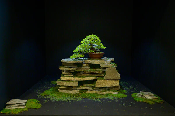 「RegenerAction Japan 2024」での対談を契機に実現した本展示では、“リジェネラティブ”というテーマを、新陳代謝や「積み上げたものを感じる」という視点から捉え、積み上がった岩の上に懸崖のゴヨウマツを据え、足元には新陳代謝の痕として松葉が積もる。長い時間をかけ形成された岩場に根づくマツの姿を想像し、盆栽と石積みの構成によって、風景と時間の層を表現しています。