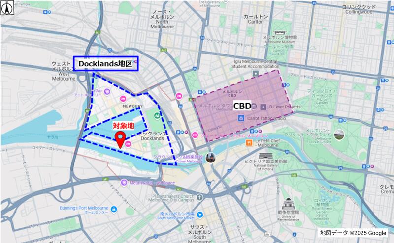 本プロジェクトは、メルボルンのCBD(中心業務地区)エリアから約1km西に位置する新興開発エリアDocklands地区に、総戸数 499戸、地上24階建の賃貸住宅を開発するものです。本プロジェクトの周辺は、オフィスや集合住宅、商業施設が集積するほか、今後の開発によりさらなる利便性の向上が期待されるエリアです。2024年10月に着工し、2027年1月の竣工に向け建築工事を進めています。