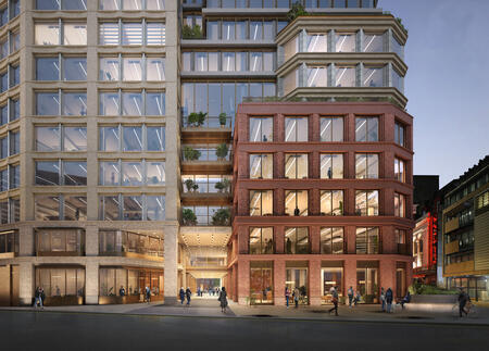周辺は景観の保全が強く求められる保存地区で、カムデン区と協働し歴史的景観と調和するデザインを採用しています。地上階には、かつて繋がっていた Old Compton Street と New Compton Street を結ぶ通路を新設し、沿道にオフィスエントランス、商業区画、起業家支援のアフォーダブルオフィスを配置することで地域活性化に寄与します。