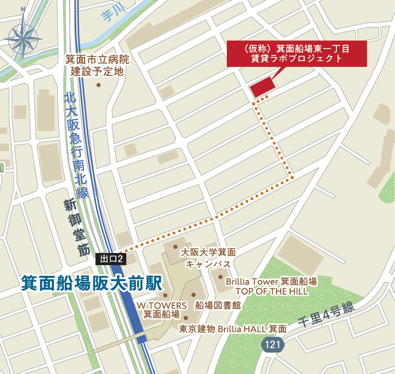 本物件は箕面船場エリア東部、「箕面船場阪大前」駅より徒歩約8分に位置し、ライフサイエンス分野の研究が盛んな大阪大学吹田キャンパスへのアクセスも優れた立地です。