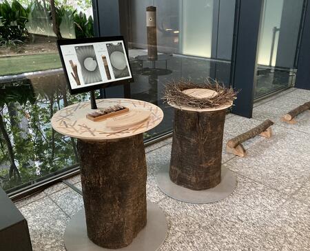 「京橋の巣箱」は、卵の殻をベースとし、「京橋の丘」の植栽剪定作業で発生する枝葉や、「大手町タワー」(東京都千代田区)敷地内の緑地「大手町の森」の管理作業で剪定された丸太などの廃材を再生利用し、3Dプリンター等のデジタル製造技術を生かして鳥の巣のように編んで制作しました。2種類のデザインを展開し、木肌に調和する卵型フォルムや丸太から自然に立ち上がる形状など、野鳥が安心して営巣できる構造を追求しています。また、野鳥の巣作りの材料として、東京スクエアガーデンで開催したイベントの廃材を提供する「巣材スタンド」も設置します。巣箱内にはライブカメラを内蔵し、ライブビュー用のモニターから、鳥たちがどの素材を選び、どのように巣を形成していくのかを観察できます。これにより、都市生活者が日常の中で自然の営みを感じ、生態系や循環型資源利用への理解を深める機会を提供します。