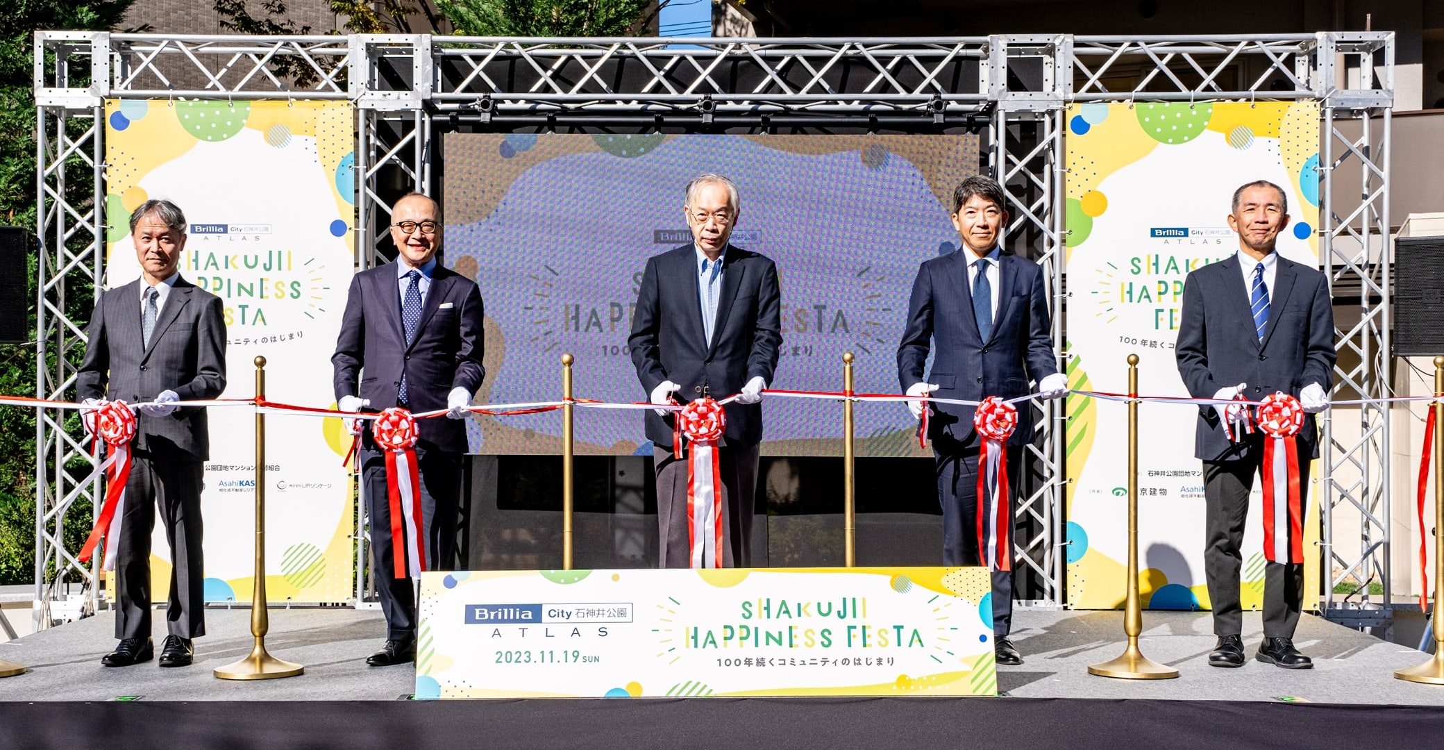 本イベントは、雲一つない晴天に恵まれました。冒頭のオープニングセレモニーでは、石神井公園団地マンション建替組合 理事長の黒河内剛氏が代表挨拶を行いました。その後、関係者5名によるテープカットを行い、まちびらきを祝いました。