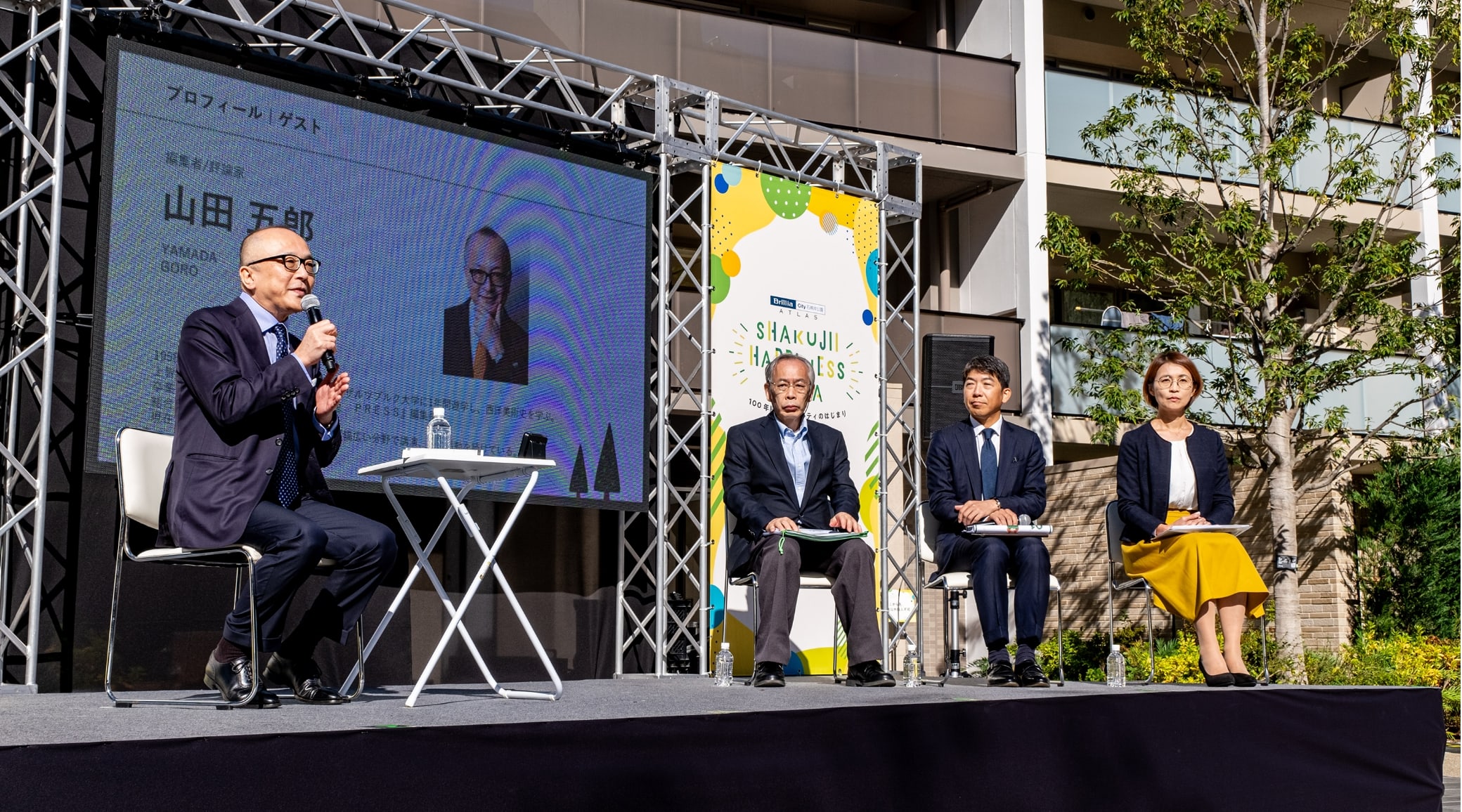 そして2023年11月19日、石神井公園団地に住まわれていた方、建替え後新たに住まわれる方、さらには地域の皆様との繋がりを創出することを目的に、まちびらきイベント「SHAKUJII HAPPINESS FESTA」(シャクジイ ハピネス フェスタ)を「Brillia City 石神井公園 ATLAS」敷地内にて開催しました。評論家の山田五郎氏などが登壇したオープニングセレモニー・トークイベントのほか、旧団地サークルによるステージパフォーマンスの開催や周辺地域のショップによるマルシェの出店など、旧団地コミュニティの継承だけでなく地域に開らかれたコミュニティの醸成を図りました。今回は、イベント当日の様子をご紹介します。